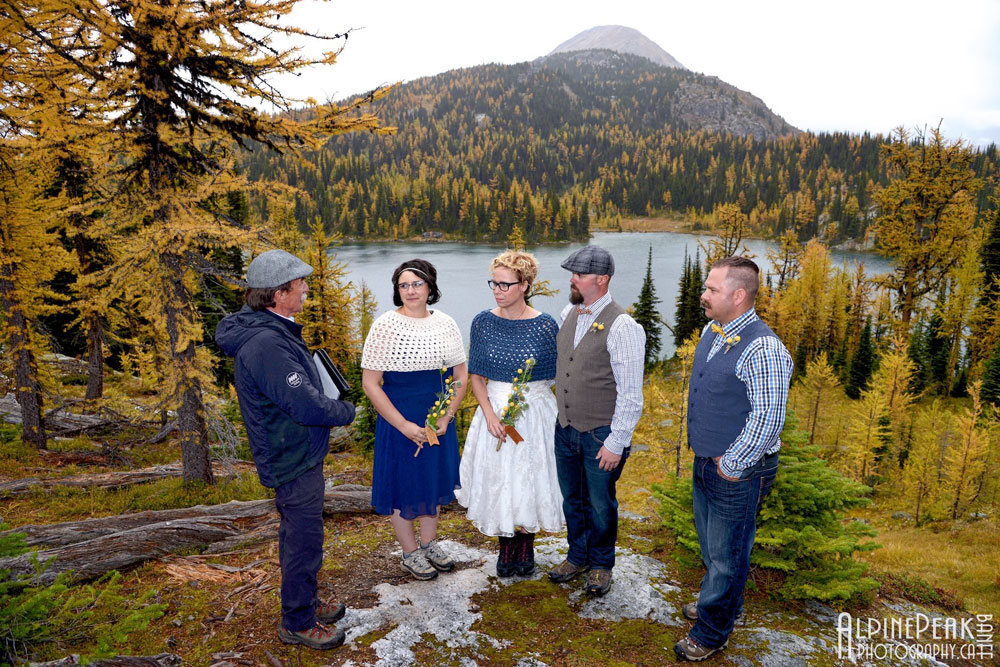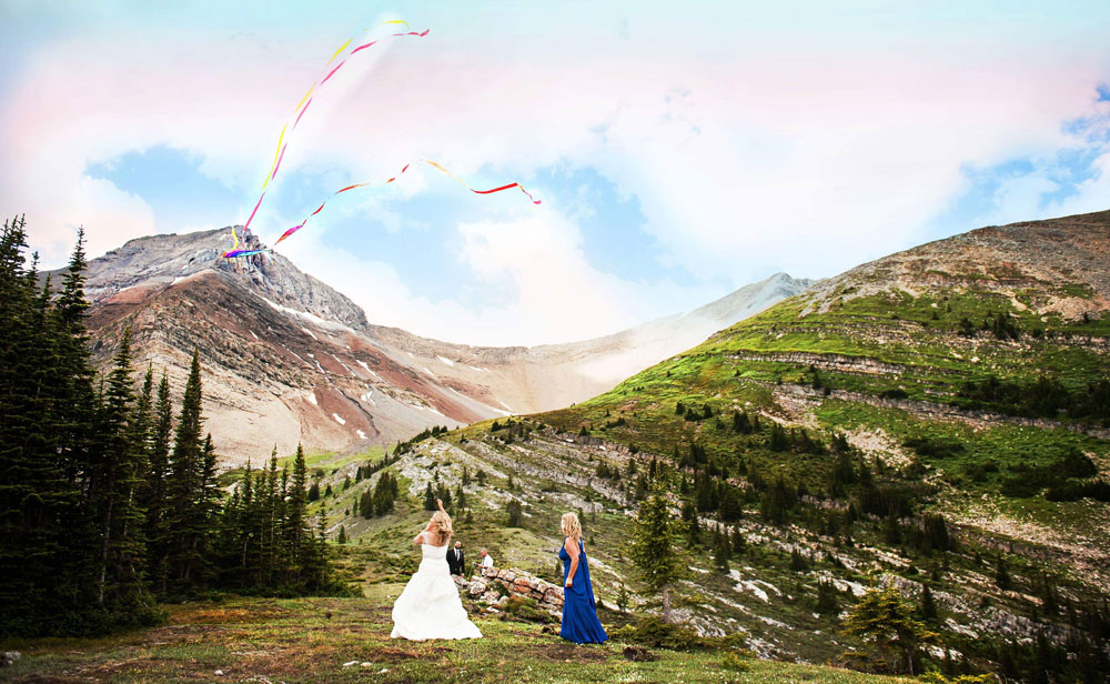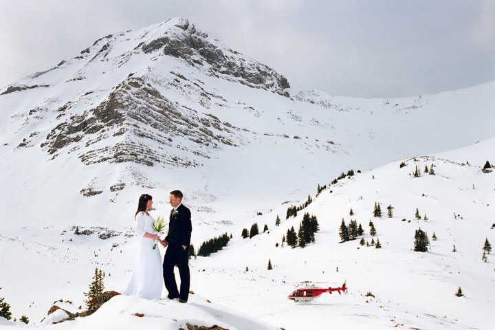 Meet your wedding party and marriage commissioner/guide Martha at Alpine Helicopter’s base in Canmore, Alberta. Add a fun flare to your wedding clothes with mountain boots and a warm jacket, maybe even snowshoes. Board your helicopter with your small crew and fly up to a high mountain ridge or alpine meadow, among lofty peaks and perhaps with bighorn sheep or marmots.
