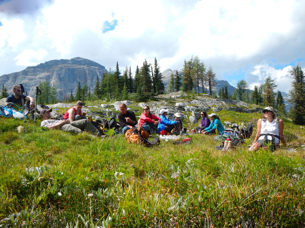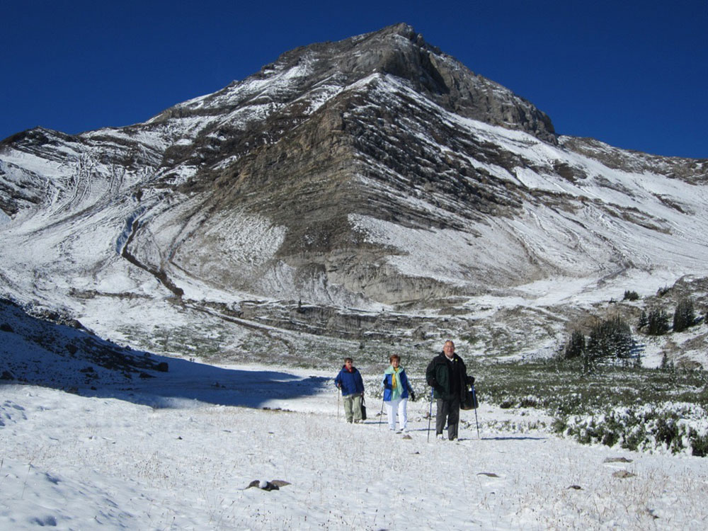 We match our ceremony site and hike to the weather and the group, sometimes we land in an open saddle and hike up to the summit of the Wedding Mound, about 100 m up a spectacular ridge. We can also land on an alpine ridge and hike down steep grassy slopes 200 m to a lovely saddle with a creek at tree line. Strong hikers might wish to land at the Medicine Wheel and work their way down a rocky ridge to the saddle and then up to the Wedding Mound summit.