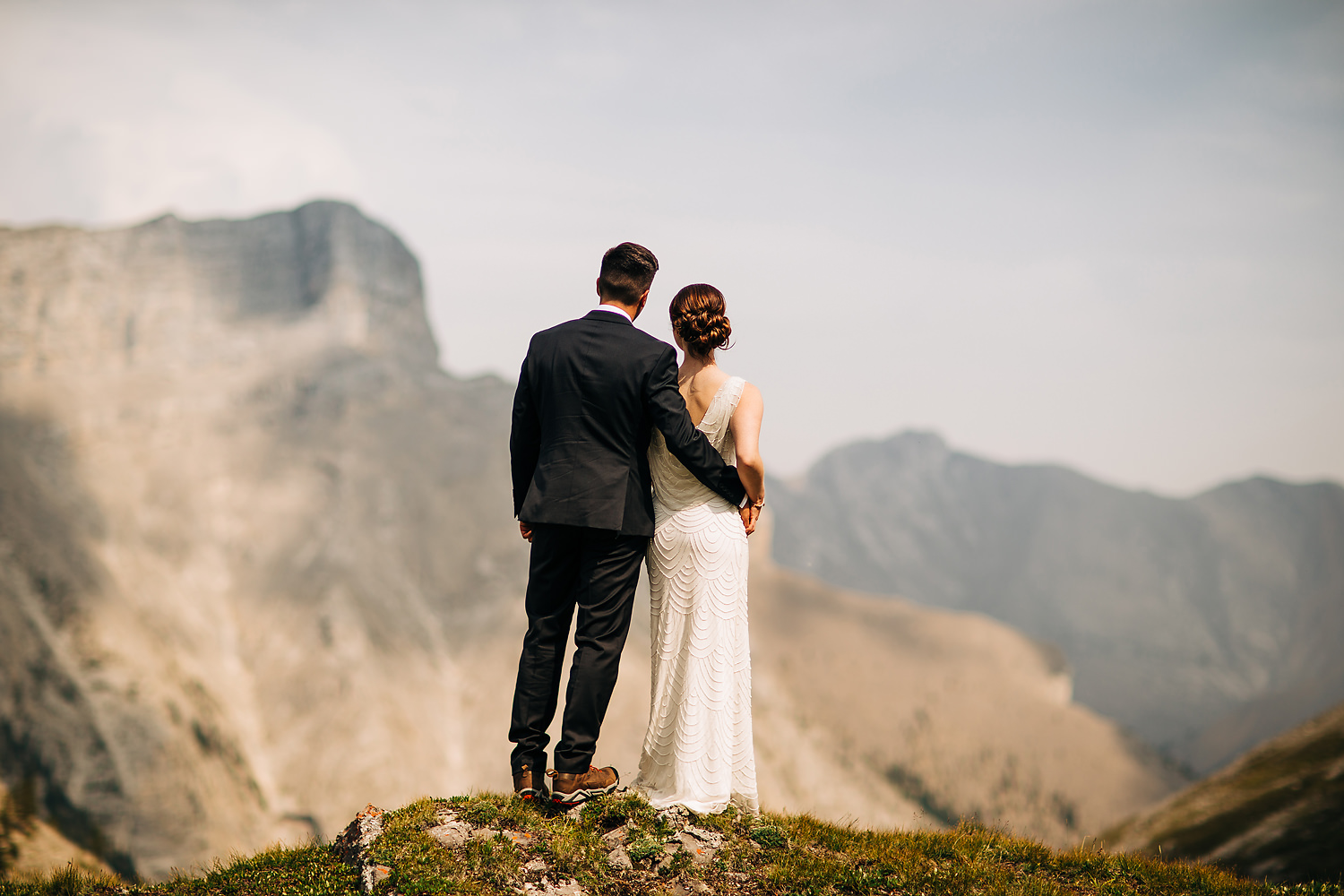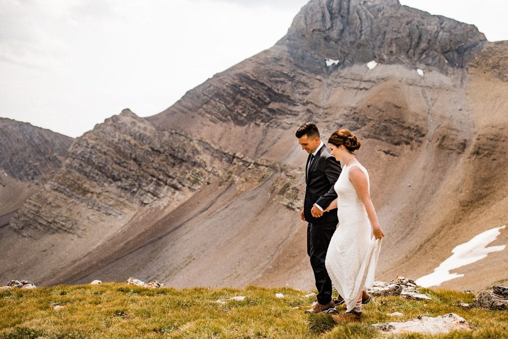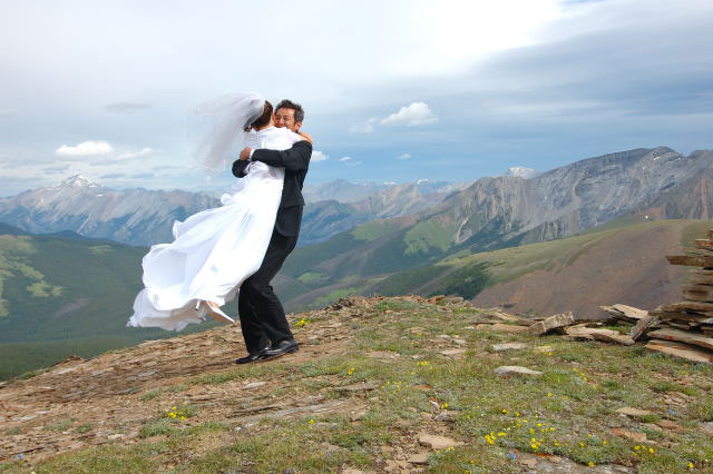 Board Alpine Helicopter’s Bell 407 helicopter and climb smoothly up over 1000 m passing Mt Grotto and Mt Lady MacDonald to Mt Charles Stewart in a spectacular 6-8 minute flight. Here we have a variety of possible wedding sites offering mountain top views, slightly lower alpine ridges, or more sheltered meadows with a few clusters of trees and a creek with a small waterfall. We like to go to the high sights with the biggest views, but are lucky to have options for all weather conditions and also opportunities to hike from one landing site across to another for our pick up.